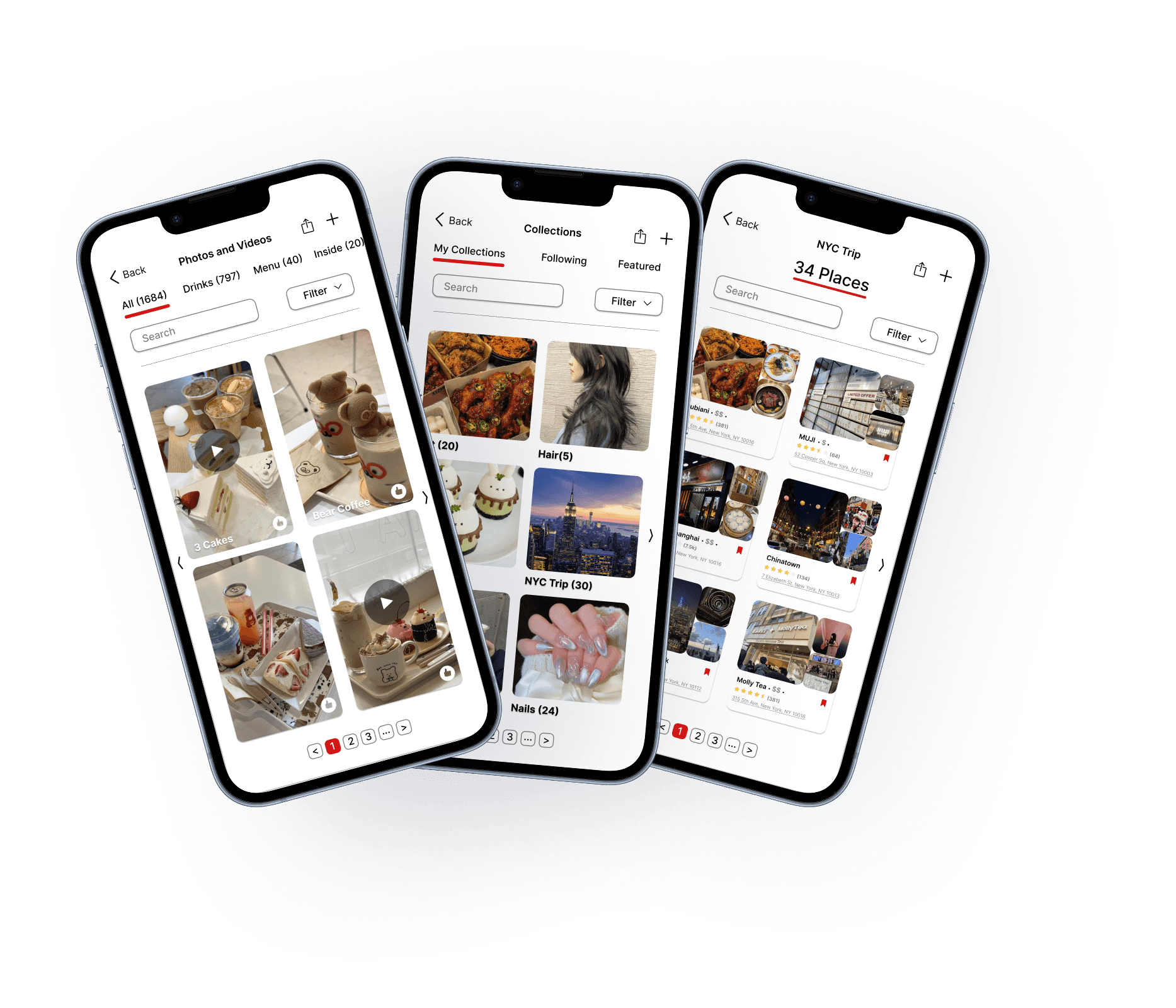 To understand key pain points, I reviewed user complaints in app store reviews and tried common user tasks myself. I also looked at how platforms like Google Reviews, Pinterest, and Xiaohongshu structure visual content and interactions, where I drew inspiration from their approaches to filtering, labeling, and visual hierarchy.