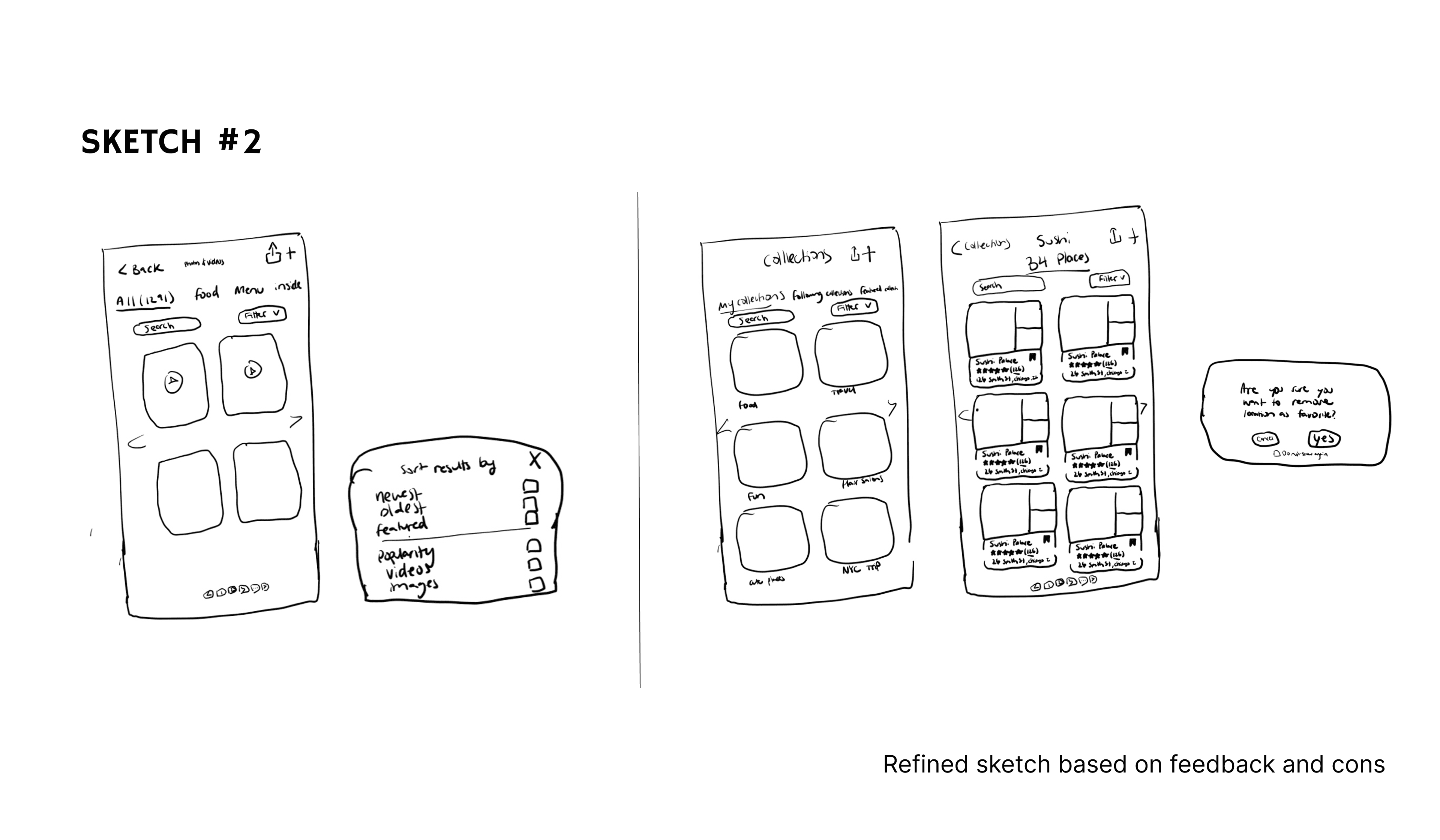 Sketch #2 refines the idea with a cleaner layout and overlay filter panel.
