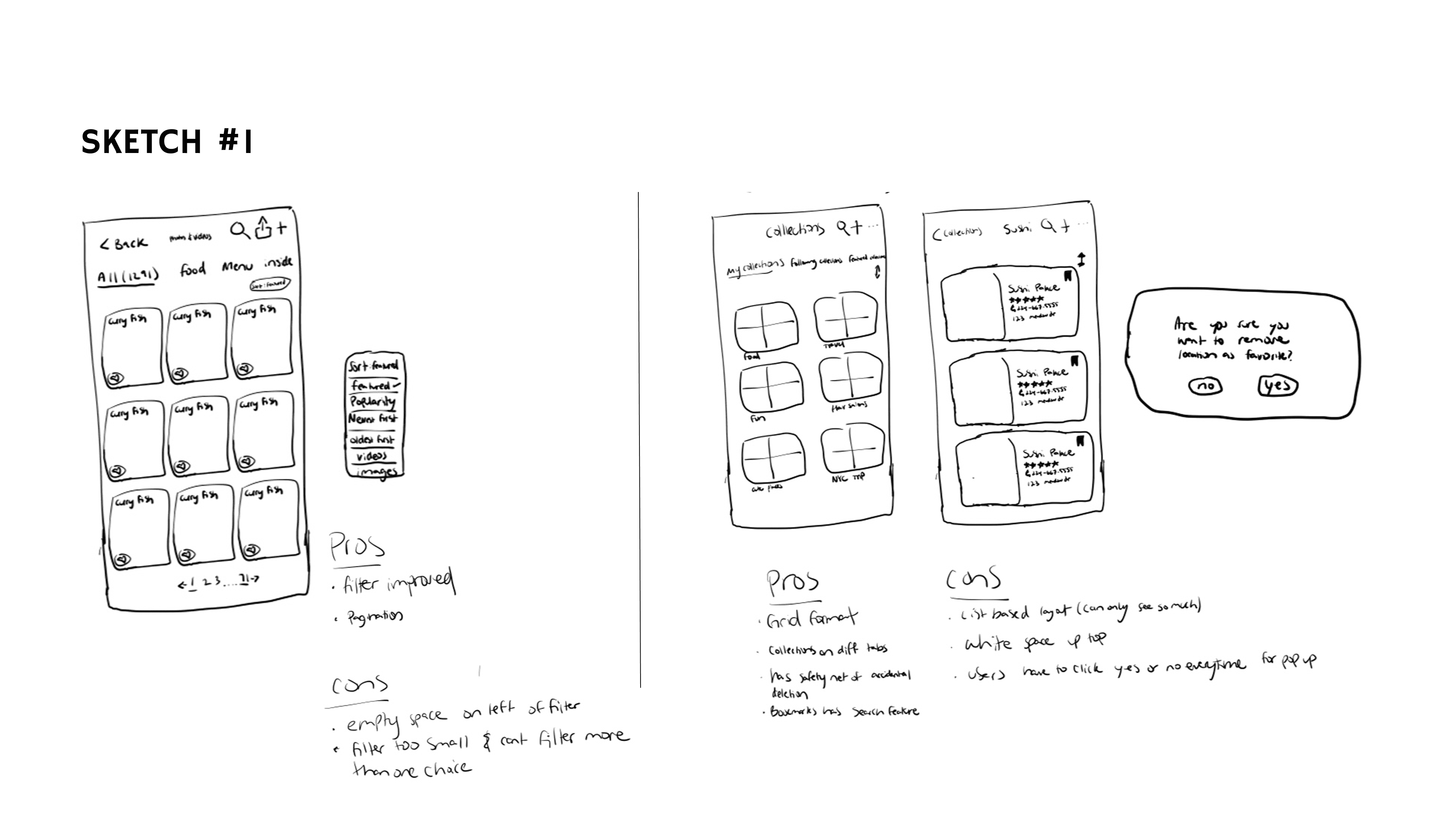Sketch #1 shows an early idea for the media screen: a two‑column grid for photos/videos with filter and sort options.